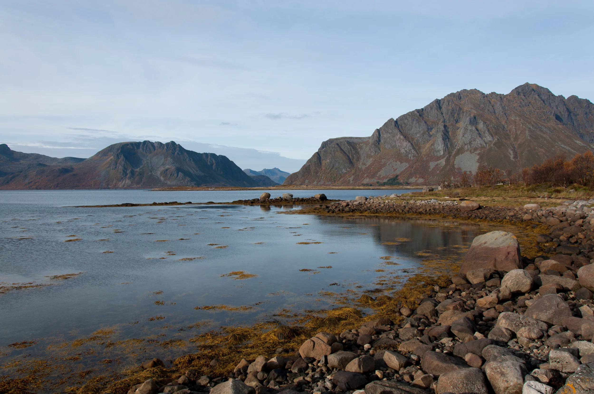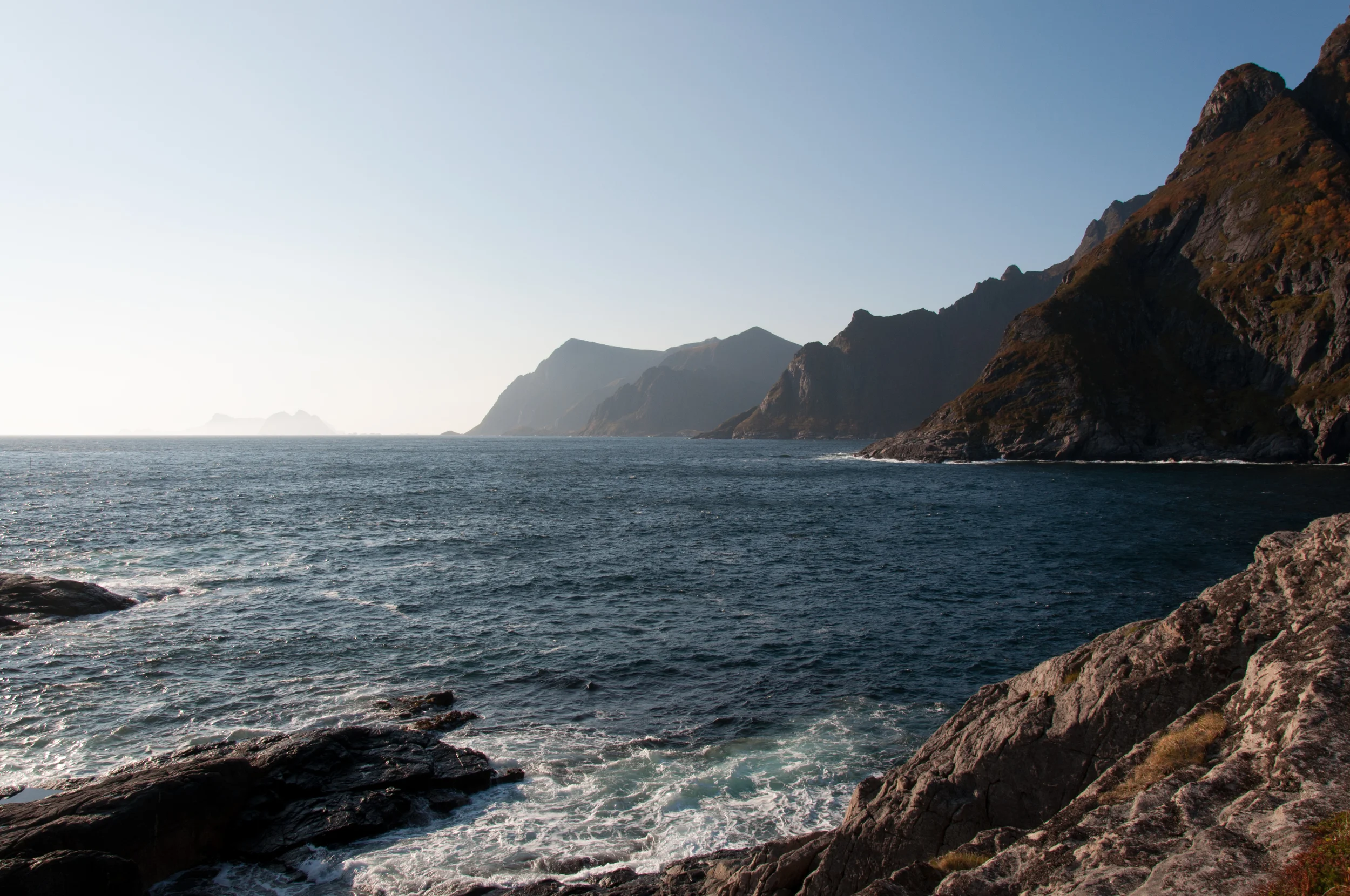 Leaving the path in Å one climbs a small crest and then descends. This topographical threshold removes civilization from view. You are left with: sea, sky, and stone. The weight of the mountains pressing behind you, the view to the sea is sweeping. It is sweeping though not because there is an unobstructed view. The craggy fingers of the land stretch before you. Due to the atmospheric perspective they fade as they recede. Like a visual echo they speak the same verse more and more softly, until they disappear.