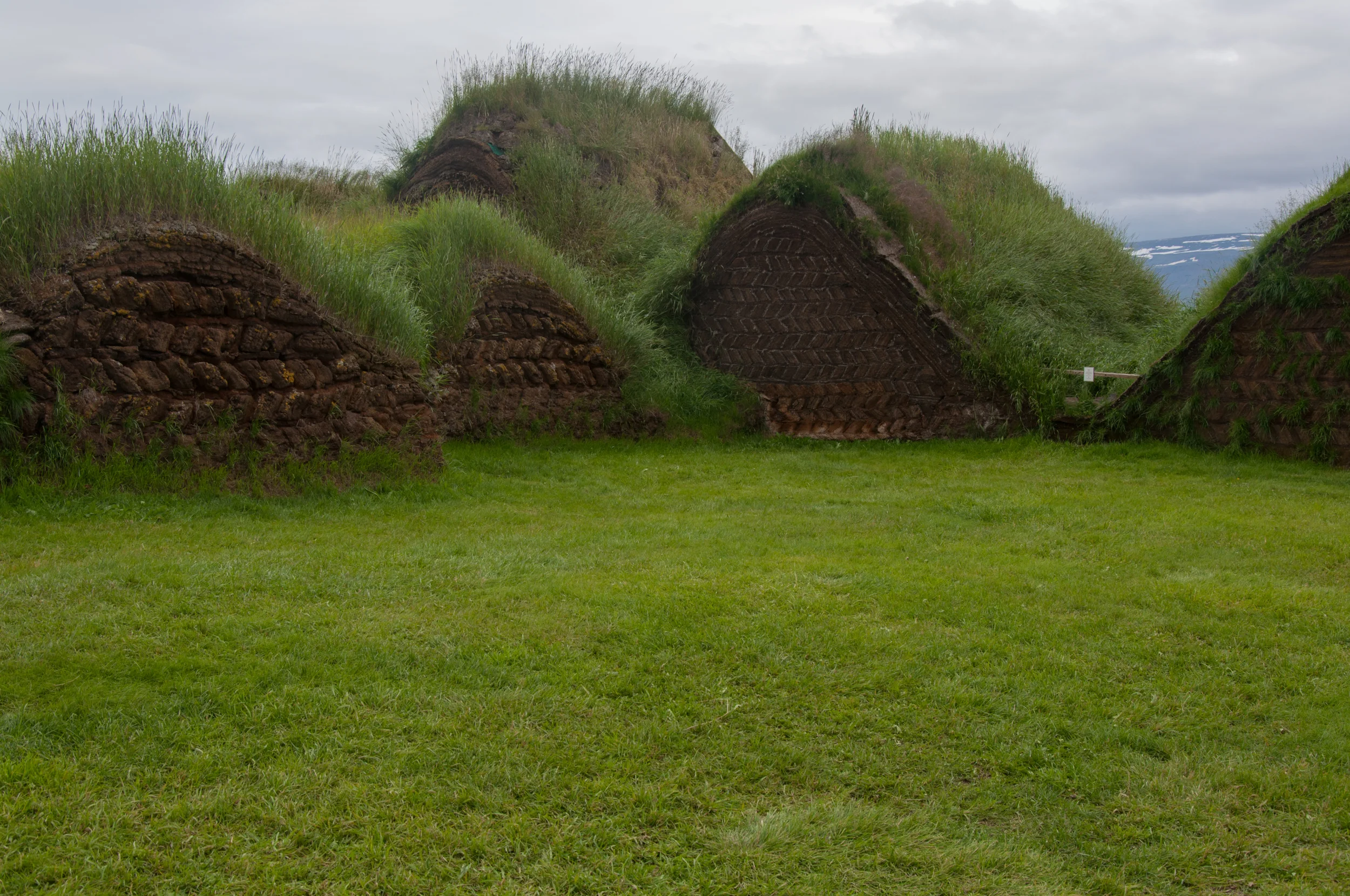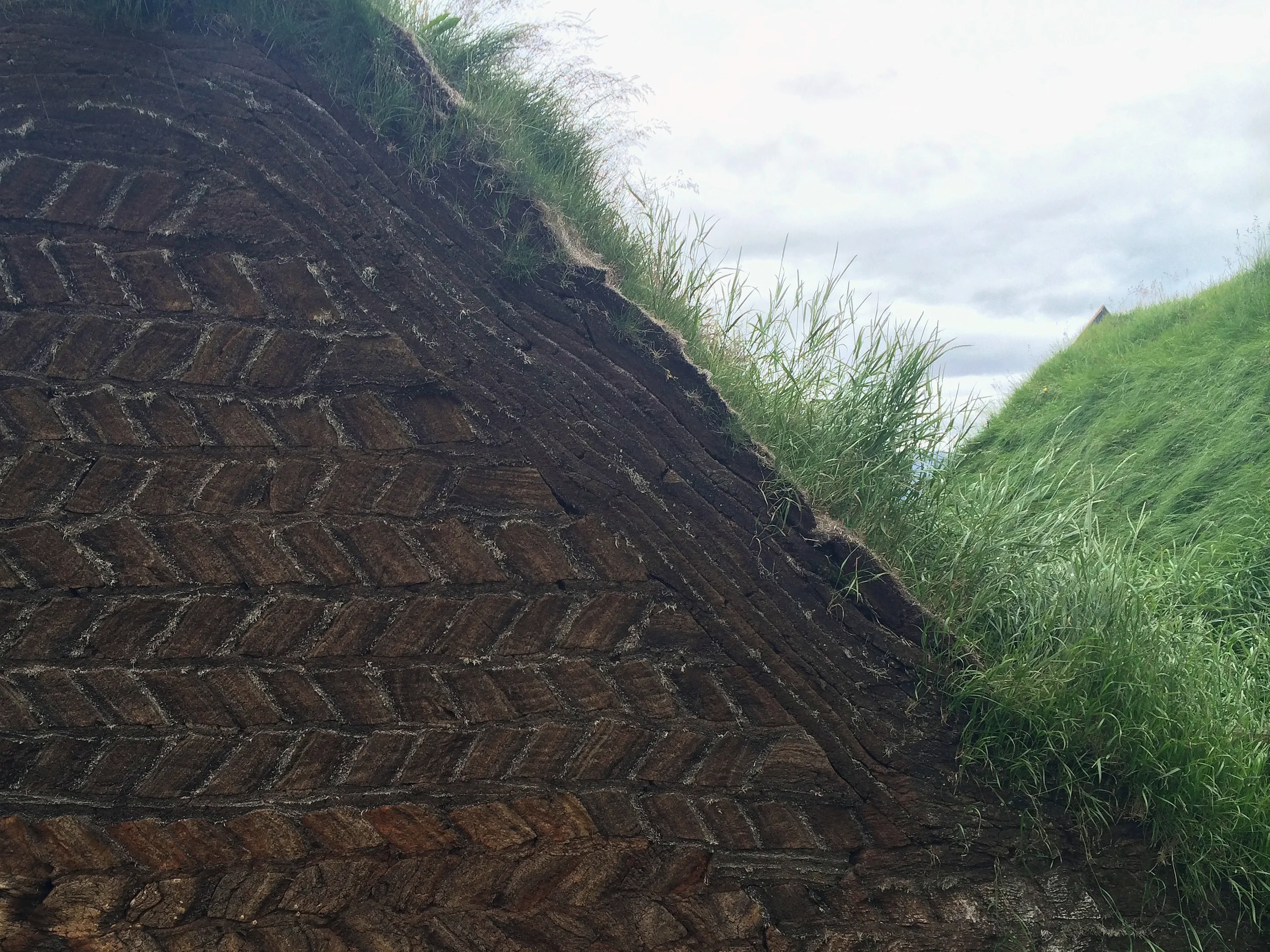Turf blocks are cut to a variety of types. Above the Glaumbærarhnaus (“Glaumbær block”) is laid on its side in the structure, crosswise to the wall; each block is as long as the entire width of the wall. Nearly twice as broad as the strips, torfa are used to cover the roof.